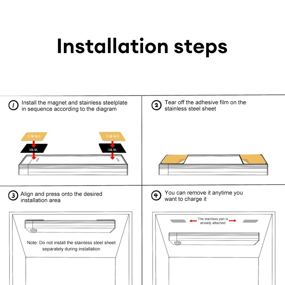 3: Recarregável: pode ser usado por muito tempo com uma única carga.O método de fixação é magnético.Retire o adesivo na parte de trás do ímã da embalagem e cole-o na parede ou armário.A luz de indução pode ser fixada ao ímã.
